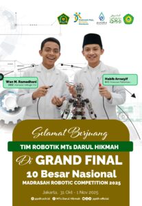 Alhamdulillah tim Dar El Hikmah Robotik Club masuk ke grand final 10 besar di Jakarta, setelah menyisihkan 70 robot dari seluruh perwakilan provinsi lain, adapun Tim Robotic antara lain; Habib Arrasyif dan Wan M. Ramadhani dengan Pembimbing Ust. Minanurrohman, Lc.SS.